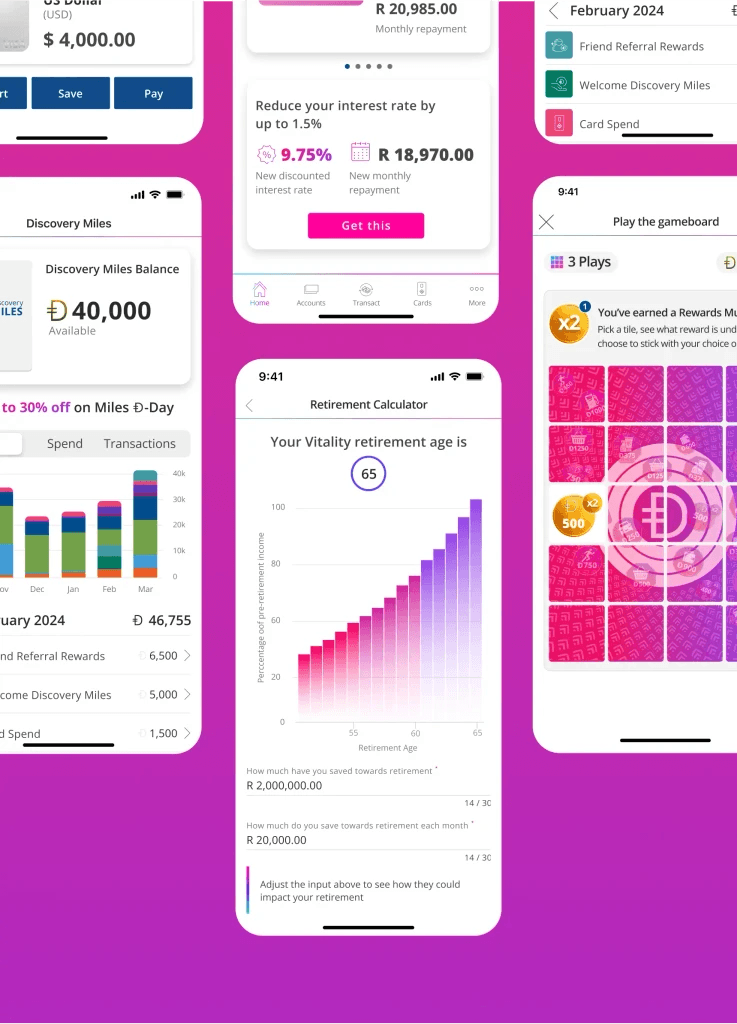 We collaborated with Discovery Bank to conceptualise and design key features for both the app and web, including Apple Pay, Vitality Travel, Group Integration, Homeloans, and Vitality Money.